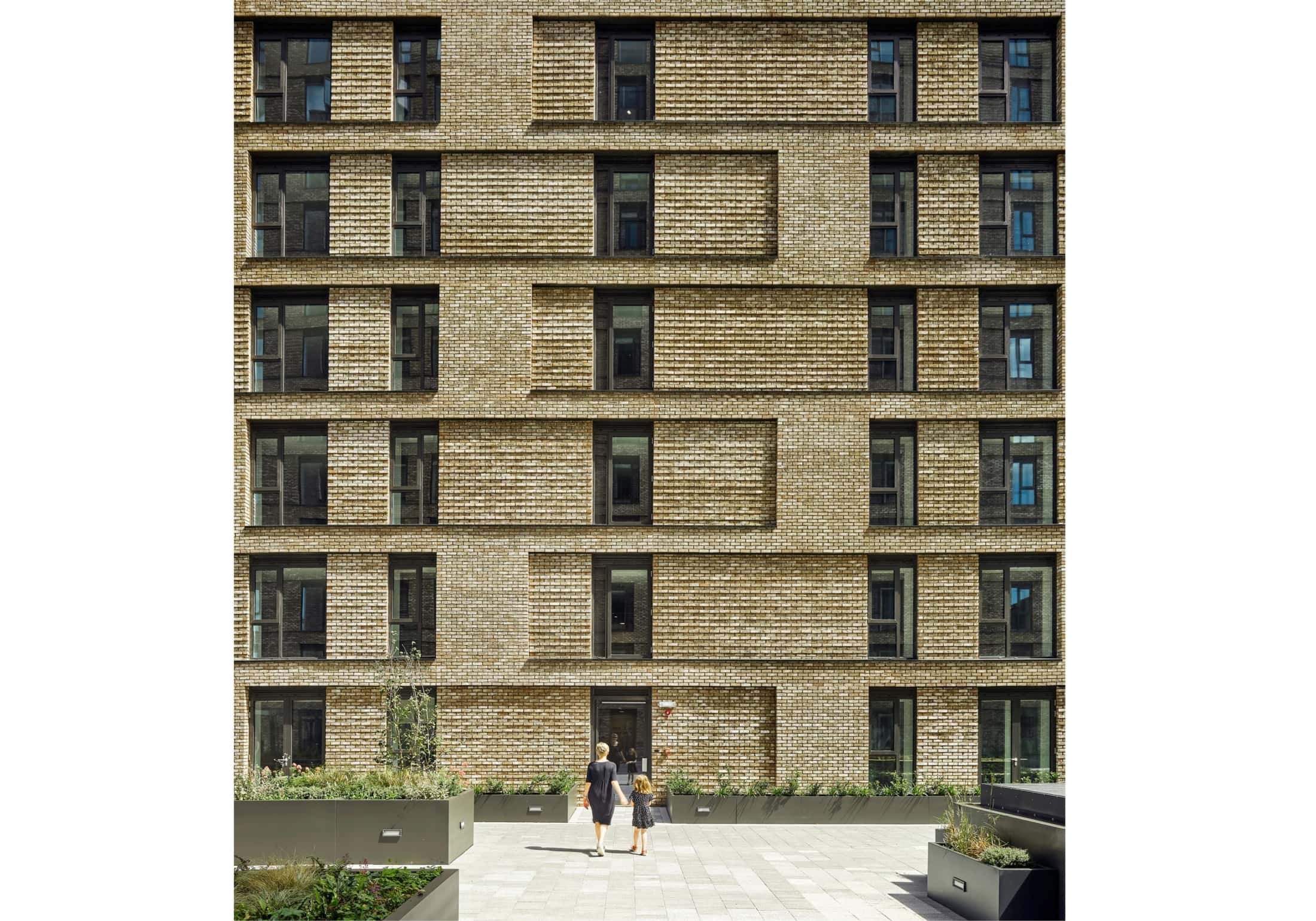 Formal, outer brick elevations contrast more playful inner elevations, which encompass an elegant podium garden where residents can enjoy landscaping by Exterior Architecture.